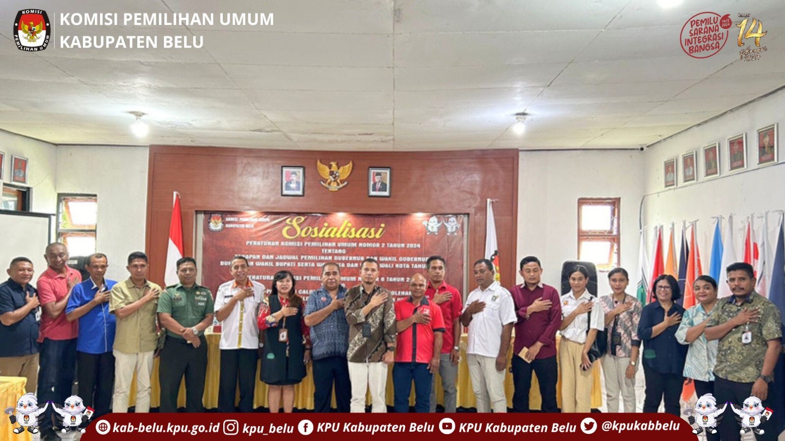 Rabu, 27 Maret 2024, bertempat di Kantor KPU Kabupaten Belu, Ketua Komisi Pemilihan Umum Kabupaten Belu, Yohanes Seven A. Palla membuka secara resmi kegiatan Sosilasisasi Peraturan Komisi Pemilihan Umum Nomor 2 Tahun 2024 Tentang Tahapan dan Jadwal Pemilihan Gubernur Dan Wakil Gubernur, Bupati Dan Wakil Bupati Serta Wali Kota Dan Wakil Wali Kota Tahun 2024 dan Peraturan Komisi Pemilihan Umum Nomor 6 Tahun 2024 Tentang Penetapan Pasangan Calon Terpilih, Penetapan Perolehan Kursi Dan Penetapan Calon Terpilih dalam Pemilihan Umum. Kegiatan yang bertujuan menyebarluaskan informasi, terkait Tahapan dan Jadwal Pemilihan Tahun 2024, khususnya Pemilihan Bupati Dan Wakil Bupati; serta Penetapan Perolehan Kursi dan Penetapan Calon Terpilih hasil Pemilu Anggota DPRD Kabupaten Tahun 2024. Maria Gizela Lumis, Anggota KPU Kabupaten Belu, Divisi Sosialisasi, Pendidikan Pemilih, Partisipasi Masyarakat dan Sumber Daya Manusia, dalam penyampaian materi, menegaskan bahwa Tahapan Pemilihan Bupati dan Wakil Bupati Belu Tahun 2024 telah dimulai dengan ditetapkannya Peraturan KPU Nomor 2 Tahun 2024. Pada waktu bersamaan, tahapan Pemilu Tahun 2024 sementara berlanggsung, yaitu Penetapan Pasangan Calon Terpilih, Penetapan Perolehan Kursi Dan Penetapan Calon Terpilih. Hadir dalam kegiatan dimaksud, Bawaslu Kabupaten Belu, Polres Belu, Dandim 1605 Belu, Kesbangpol Kabupaten Belu, Partai Politik Peserta Pemilu Tingkat Kabupaten Belu, serta Pihak Media Massa.