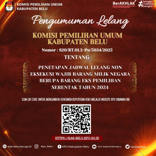Atambua, kab-belu.kpu.go.id - Komisi Pemilihan Umum Kabupaten Belu akan Melaksanakan Lelang Non Eksekusi Wajib Barang Habis Pakai Eks Pemilihan Serentak Tahun 2024 dengan perantaraan KPKNL Kupang berupa Surat Suara, Kotak dan Bilik Suara Pemilihan Serentak Tahun 2024.