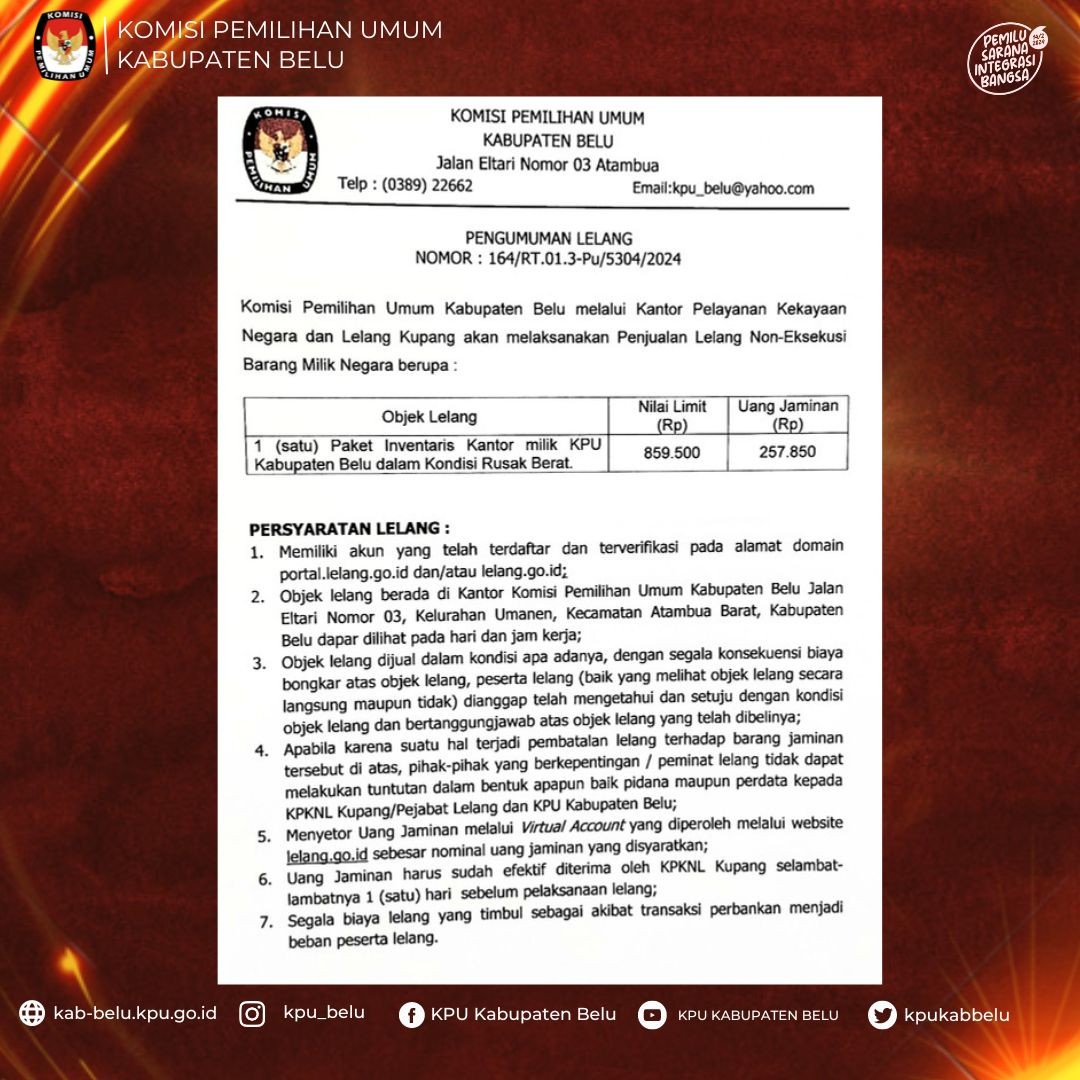 Komisi Pemilihan Umum Kabupaten Belu melalui Kantor Pelayanan Kekayaan Negara dan Lelang Kupang akan melaksanakan Penjualan Lelang Non-Eksekusi Barang Milik Negara
