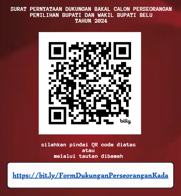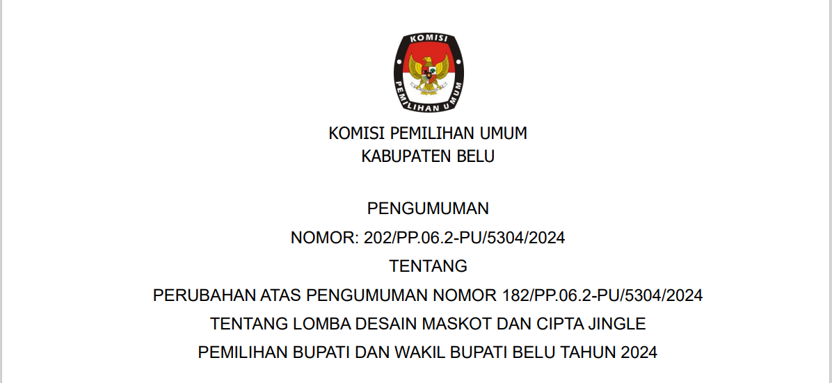 Pengumuman Nomor 202/PP.06.2-PU/5304/2024 tentang Perubahan Atas Pengumuman Nomor 182/PP.06.2-PU/5304/2024 tentang Lomba Desain Maskot Dan Cipta Jingle Pemilihan Bupati Dan Wakil Bupati Belu Tahun 2024 dapat dilihat disini ...