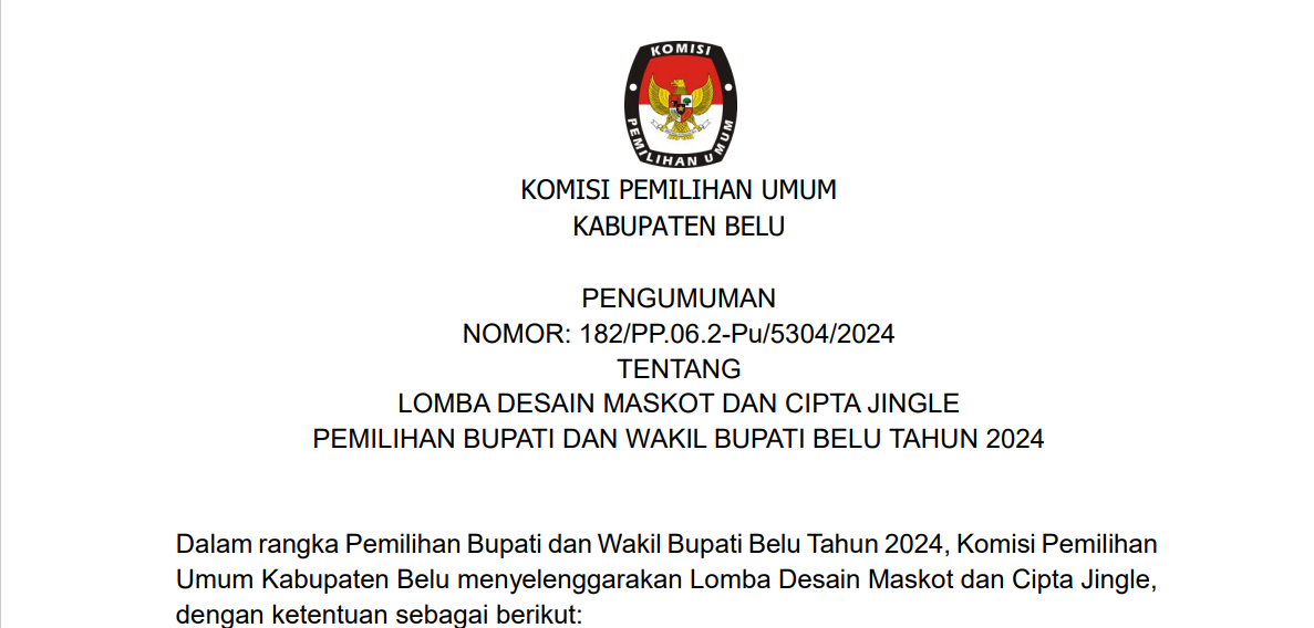 Pengumuman Nomor 182/PP.06.2-Pu/5304/2024 tentang Lomba Desain Maskot Dan Cipta Jingle Pemilihan Bupati Dan Wakil Bupati Belu Tahun 2024, selengkapnya dapat dilihat disini...