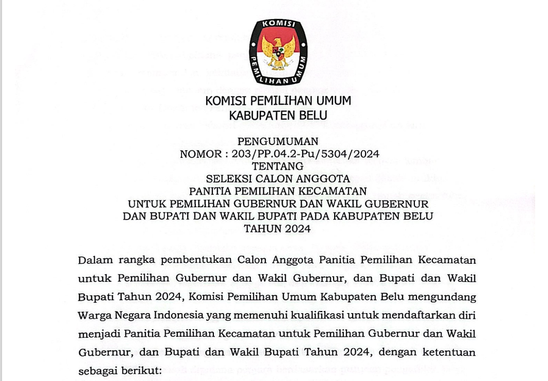 Pengumuman Nomor 203/PP.04.2-PU/5304/2024 tentang Seleksi Calon Anggota Panitia Pemilihan Kecamatan Untuk Pemilihan Gubernur Dan Wakil Gubernur dan Bupati Dan Wakil Bupati Pada Kabupaten Belu Tahun 2024 dapat dilihat disini ...