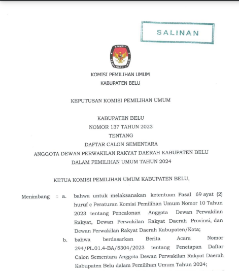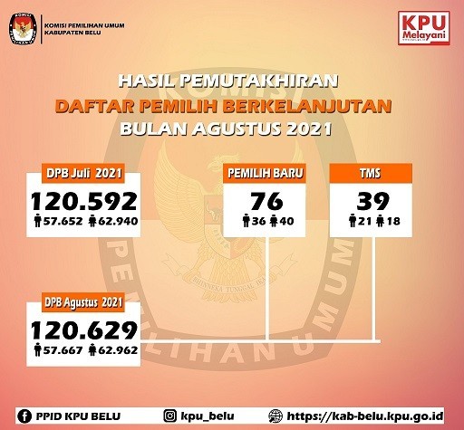 Rekapitulasi Daftar pemilih bulan Juli tahun 2021 tingkat KPU Kabupaten Belu berjumlah 120.592, jumlah ini menurun dari jumlah rekapitulasi bulan sebelumnya yang berjumlah 120.594, ini dikarenakan banyaknya jumlah pemilih TMS (Tidak Memenuhi Syarat) diantaranya meninggal, alih status polri dan pindah domisili, dalam proses ini KPU Kabupaten Belu berkoordinasi dengan BPMD Kabupaten Belu, tanggapan dari masyarakat dan juga sistem jemput bola di lapangan. Sementara itu KPU Kabupaten Belu juga terus berkoordinasi dengan pihak-pihak terkait diantaranya Disdukcapil Kabupaten Belu, TNI/POLRI dan juga bantuan dari mantan penyelenggara Ad Hock Pemilu sebelumnya yg masih bersedia membantu KPU Kabupaten Belu dalam Pemutakhiran Daftar Pemilih Berkelanjutan.